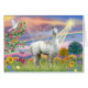 This peaceful scene in pastel hues shows a llama with an angel in the clouds looking over a beautiful landscape of mountains and colourful foliage. The sun is breaking through the clouds and peace reigns.