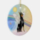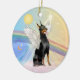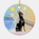 A Doberman Pinscher angel floats in heaven's fluffy clouds with a shining sun and star and moon in the distance