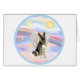 A German Shepherd angel floats in heaven's fluffy pastel clouds. Personalization is available through the "Custom" button.