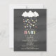 A neutral baby shower invitation featuring an illustration of clouds with multicolor hearts hanging from them. Customize the text with details of your occasion. Background is dark grey watercolor inspired design.
