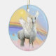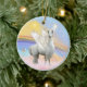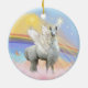 A llama angel floats in heaven's fluffy clouds with a shining sun. A star shines down and the moon can be seen in the distance.