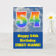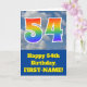 The front of this fun 54th birthday greeting card design features a representation of a blue sky with clouds, along with the number "54" having a multicolored rainbow spectrum like gradient look. The front also features a birthday greeting message, including a customized recipient name. The inside features a custom birthday greeting message, or could perhaps be cleared and left blank if a message is to be written by hand instead. A customizable birthday card like this might be a fun way to send birthday wishes to somebody who is celebrating their fifty fourth birthday. [~Z0000370]