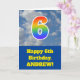 The front of this fun 6th birthday greeting card design features a cloudy blue sky depiction, along with the number "6" having a multicolored rainbow spectrum like gradient look. The front also features a birthday greeting message, including an editable recipient name. The inside features an editable birthday greeting message, or could perhaps be cleared and left blank if a message is to be written by hand instead. A custom birthday card like this might be a fun way to send birthday wishes to somebody who is celebrating their sixth birthday. [~Z0000370]