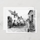 A hand-drawn black and white sketch of Clovelly, Devon, a historic fishing village famous for its steep cobbled street, stone cottages, and picturesque harbor. This vintage-style line illustration captures the charm of coastal England and its timeless heritage. Perfect for lovers of travel, maritime history, and traditional village scenes.