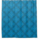 This shower curtain features a captivating and unique design. The pattern uses several shades of blue and teal, which, when repeated, form a shape that resembles a pointed-petal clover. This creates a visually interesting and dynamic look.