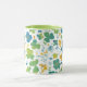 This whimsical illustration features an array of colourful clovers and small flowers scattered across a white background. The clovers are depicted in various shades of green, with some featuring textures and subtle gradients. Interspersed among the clovers are bright blue and yellow flowers, adding a vibrant touch to the pattern. The overall design exudes a cheerful and playful vibe, reminiscent of a lively spring meadow.