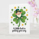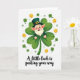 This greeting card features a rosy-cheeked leprechaun peeking from behind an oversized four-leaf clover, his friendly grin and twinkling eyes aimed right at the reader 💚. He wears an emerald top hat with a golden buckle, and his full white beard curls around his cheeks as if he’s leaning in for a close, friendly hello. The clover fills most of the center, shaded in rich greens with soft gradients that make each leaf look rounded and plush against a bright white background. Around the main pair, small clovers drift like confetti, and shiny gold coins marked with an “X” float nearby, adding a hint of shared treasure and inside-joke charm between friends ☘️. A few faint green glowing dots hover in the open space, giving the scene a light, airy sparkle without crowding the characters. Along the bottom edge, the phrase “A little luck is peeking your way” is placed in black, flowing lettering that stands out clearly on the white. The coins and tiny clovers are sprinkled mostly to the sides of the big clover, with the brightest gold highlights catching the eye near the leprechaun’s hat and the outer leaf edges.