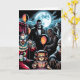 Scary colourful psychedelic comic book style clown holding a balloon next to a zombie, vampire and haunted doll Halloween card. With inside pun and colouring page.