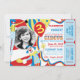 Clowns de cirque amusants en échasses, jonglant et tenant des ballons carte d'anniversaire avec insert photo en blues, rouge, blanc et jaune avec billets de tombola à côté. Il suffit de perforer les côtés pour une déchirure facile!