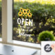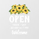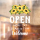 Open hours window clings with OPEN in rustic letters beneath a cluster of sunflowers and green leaves for a country chic look. Add your opening hours. Welcome in a readable script. Sunflower-themed opening hours window cling for your store, shop, or boutique with a bright and sunny floral design with lots of sunflowers.