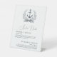Elevate your wedding bar with this elegant pedestal sign, featuring an illustration of an anchor in a herald with a banner. This charming sign showcases the bride and groom's signature drinks, inviting guests to 'Raise a Glass' and enjoy the celebration.