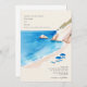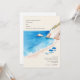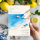 Wedding invitation featuring a watercolor illustration of a scenic Mediterranean beach with two blue umbrellas.
