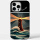 A lighthouse stands tall against a backdrop of rolling waves and a distant cityscape, its beacon shining brightly against the darkening sky.