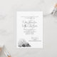 White wedding by the sea invitations. Tropical seashell design invitation with black text on white paper. A group of realistic beach shells in the lower corner and text is calligraphy font style.