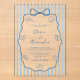 This coastal blue whimsical wedding acrylic invitation features a coquette scalloped frame with a bow on a background of watercolor stripes, hand drawn beach seashell doodles, and handwriting script.