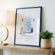 Beautiful and elegant unique personalized gift for new homeowners, newlywed's first home, and house warming gifts. Our design features our own hand-painted watercolor coastal blue beachy theme front door. Accented with black front porch light, door handle, silver hardware, light grey trim. A white and navy stripe doormat with a modern potted plant. A cozy wooden rocking chair with a starfish decor pillow completes this beachy style home design. Add your own text, optional address, and est. year. All illustrations are hand-painted original artwork by Moodthology.