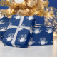 This beautiful coastal Christmas wrapping paper features a pattern of starfish, sand dollars, and silver glitter coral on a navy blue background.