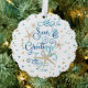 Send unique Christmas holiday greetings with a costal, beach or tropical photo ornament card with a fun twist on the traditional Season's Greetings with SEAS & GREETINGS in an elegant calligraphy script typography accented by starfish and turquoise and golden, sandy brown dots and year on the front and your picture and name on the back. ASSISTANCE: For help with design modification or personalization, colour change, resizing, transferring the design to another product or if you would like coordinating items, contact the designer BEFORE ORDERING via the Zazzle Chat MESSAGE tab or email makeitaboutyoustore@gmail.com.