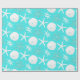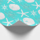 Beautiful coastal Christmas wrapping paper features a pattern of starfish, sand dollars, and glitter coral in an aqua and white color scheme.