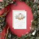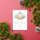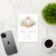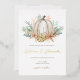 Coastal, fall theme wedding invitation features a watercolor pumpkin surrounded by starfish and sand dollar seashells, coral, and palm and eucalyptus greenery in an earth-toned, autumn colour palette. The couple's names take centre stage with the added lustre of gold foil.