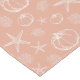 Coastal Fall table runner featuring pumpkin, coral and starfish seashells in white on a coral orange background. Perfect for beach themed autumn entertaining and Thanksgiving celebrations.