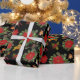 Where the forests meet the sea, coastal pine wrapping paper of poinsettias, acorns, holly, fall leaves and a black background.