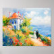 impressionist painting of a charming coastal house surrounded by colourful flowers. The vibrant colours and textured brushstrokes create a dreamy summer retreat by the sea.