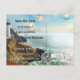 Save the Date postcard featuring a painting of a coast with a lighthouse in vibrant colors. Beautiful for a destination wedding or a wedding with a nautical theme.