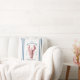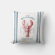 Coastal Lobster Beach House pillow features a white background with a red watercolor style Maine lobster and navy blue rope stripes. Personalize it with your family name and the date established in a classic navy blue font. Perfect for summer beach homes and waterfront cottages.