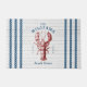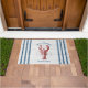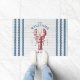 Coastal Lobster Seaside Beach House doormat features a white background with a red watercolor style Maine lobster and navy blue rope stripes. Personalize it with your family name and the date established in a classic navy blue font. Perfect for summer beach homes and waterfront cottages.