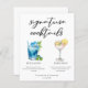 Cette carte de cocktails de marque côtière chic propose une typographie noire simple au-dessus de 2 boissons balnéaires et leurs ingrédients pour votre bar de mariage de plage. Un joli dessin de martini à la goutte de citron et de lagon bleu ajoute une touche cool à votre menu du bar. Complétez avec les noms du couple et la date de leur réception.