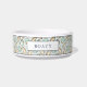 Pamper your seafaring pooch with our personalized dog bowl, featuring a pattern of watercolor oyster and pearl illustrations in light aqua and warm ivory, on a pale aqua background. A thin navy border at the top and bottom adds to the preppy charm of this summery doggie dish. Personalize with your pup's name in classic navy blue lettering.