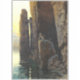 The scene unfolds along a dramatic coastline bathed in the golden light of dawn. Jagged brown cliffs rise like columns, their fractured surfaces catching the warm glow of a sunrise that bleeds across the sky. The relentless ocean crashes against the cliffs, the whitecaps of the waves a stark contrast against the deep blue water. This dynamic diagonal line cuts towards the centre-left of the artwork, creating a sense of movement and power. --- Juxtaposed against this dynamic backdrop sits a solitary figure perched on a smaller, jutting rock. Here, basking in the golden light, is a captivating mermaid, the very embodiment of idealized beauty. Her form is strong and curvy, sculpted by a life spent navigating the currents and evading predators. Her powerful legs, ending in webbed, fin-like feet, hint at her life in the sea. Her posture is both confident and graceful, reminiscent of a model, yet completely at ease in her natural environment. --- She is adorned with long, curly green-grey hair, interwoven with strands of seaweed, that cascades down her back. Her smooth, green-grey skin shimmers in the morning light. Unlike human women burdened by gravity, her breasts possess a natural fullness, reflecting a life spent suspended in the buoyant embrace of the sea. --- But the scene takes an unexpected turn. Lurking in the shadows of the background are two other figures. Their forms, obscured by darkness, reveal themselves to be elderly mermaids. Their wrinkled faces and wiry builds stand in stark contrast to the youthful beauty of the central figure. Yet, there's a glint in their aged eyes, a flicker of something far removed from their weathered visages. --- One, his back hunched and gnarled with barnacles, watches with a predatory glint. Memories stir within him, of a time when his own tail propelled him through the water with similar grace. Now, his movements are slow, his desires a dull ache in his ancient bones. But the sight of this young beauty ignites a spark, a desperate yearning for a taste of the vibrancy she embodies. --- The other, his beard a tangled mess of seaweed, lets out a low, guttural chuckle. He sees a different kind of beauty; a raw, primal allure that transcends time. His mind conjures images of forbidden pleasures, of exploring the depths of her form in a way the ocean never could. A current of envy courses through him, a longing for the vitality and confidence she possesses. --- The artist masterfully uses light and shadow to create a sense of depth and mystery. The warm glow of the sunrise bathes the foreground in a golden light, while the background recedes into cool shadows, leaving the motives of the older mermaids shrouded in secrecy. The tension between the idealized beauty of the central mermaid and the shadowy figures behind her compels the viewer to speculate about the forbidden desires simmering beneath the surface. --- This work by Georg Janny (1864–1935) is in the public domain in its country of origin and other countries and areas where the copyright term is the author's life plus 70 years or fewer. This work is in the public domain in the United States because it was published (or registered with the U.S. Copyright Office) before January 1, 1928.