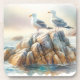 This serene coastal illustration captures two seagulls poised atop a sun-washed rocky cliff, overlooking calm, rippling water. Rendered in a soft watercolor style, the scene feels airy and peaceful, with gentle brush textures that blend stone, sea, and sky into a harmonious composition. Muted blues, sandy beiges, misty grays, and hints of seafoam create a soothing pastel color story that evokes quiet mornings by the shore. The overall mood is tranquil and reflective, balancing natural realism with a slightly whimsical, painterly touch. This artwork carries a cozy coastal charm, blending folk and cottagecore influences with an open, breezy atmosphere that feels timeless and calming. AI generated artwork.