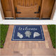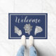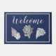 Nautical seashells doormat for any coastal seaside home. Navy blue background with white and grey seashells. "Welcome" is in white script typography.
