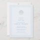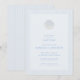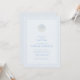 Elegant baptism invitation design featuring a hand-painted blue and white shell on a soft blue background. Subtle blue-beige stripes add depth, while the mix of sans-serif and decorative serif typography creates a timeless, coastal feel—perfect for classic, minimalist, seaside-inspired baptisms. The shell represents an old baptism symbol that was used to pour the water.