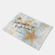 This Welcome Doormat has a beautiful coastal starfish print with one large and small realistic starfish and several others overprinted in white on light blue background and Welcome in a script font. Look for other products in this Coastal Starfish Collection. Text reads: Welcome To Our Beach House. Customizing your family name is easy to do. Design by Jenn's Emporium.