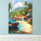 Oil painting of a colourful coastal village with boats resting on a sandy beach. Lush greenery and mountains form a serene backdrop.