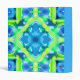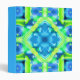Binder in a tie dye pattern in shades of cobalt blue, turquoise, and lime green, accented with white