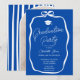 A simple cobalt blue graduation layout with a soft hand drawn coquette-inspired ribbon frame and elegant script typography. The front features a refined invitation design with a bow detail, while the reverse side highlights a full photo framed by bold vertical stripes for a stylish, fashion-forward look.