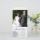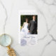 This sweet Wedding Thank you photo card has a dark cobalt blue, soft periwinkle blue and soft lilac purple hydrangea floral bouquet at the bottom left with some petals flying to the right. In the background, there is a faded damask pattern and a stripes graphic. At the top, you can personalize this with a photograph. Below, Thank you is written along with the easily customizable Thank you message and names of the bride and groom. This would be great for a spring or summer wedding.