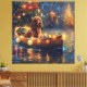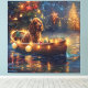 Set sail into the magic of the holiday season with this beautifully detailed illustration, showcasing a proud dog sitting in a festively decorated boat, gliding across a serene Christmas lake. The twinkling lights from nearby pine trees reflect off the water, casting a warm, festive glow that enhances the cozy ambiance. Ornaments dangle from the boat's sides, while glowing lanterns light the way, creating a scene that captures the true essence of Christmas warmth and joy. This nostalgic artwork brings a touch of holiday magic to any space, perfect for those who cherish the spirit of the season.