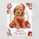 Cute english cocker spaniel puppy with Santa hat, peppermint candy cane, big red ribbon and christmas ornements, painted by artist Maryline Cazenave.