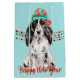 A cute black and white Cocker Spaniel dog wears a red and green Santa Claus hat in front of strings of red and green Christmas beads on both sides of this gift bag. At the bottom are text fields in matching red for your own text. Currently one side says "Merry Christmas" and the other side says "Happy New Year", but you may change them if you'd like. The images and text are placed on a lighter mint green background. Be sure to see the matching products in our store.