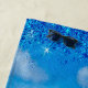 A beautiful illustration of a white sand beach with a blue sky and a cocktail. The sky and sand are decorated with glitter in blue and white