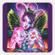 This is colourful, trippy, surreal pop illustration of a girl on the beach, drinking cocktail or mocktail. She enjoys hot summer vibes.