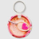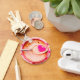 A cute pink polka dot coffee cup and saucer, filled with foamy cappuccino, and embellished with a spoon scooping a pink candy heart.