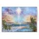 Beautiful pastel coloured seascape with palm trees, waves, jumping dolphins radiant light and sitting meditator. By Daniel B. Holeman.