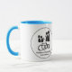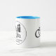 CODA mug has two logo'd design in black on a white cup with blue handle and rim.
