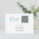 Rationalisez votre planification mariage avec nos cartes RSVP élégamment conçues, complétées par un code QR pratique qui oriente les invités vers votre site Web mariage pour des réponses faciles. Ces cartes sophistiquées ne sont pas seulement pratiques ; elles sont un composant élégant de votre papeterie mariage, avec une couleur bleu turquoise vibrante au verso qui ajoute une pop rafraîchissante de couleur et complète tout thème mariage, en particulier ceux avec des éléments audacieux ou côtiers. Chaque carte offre un grand espace pour le texte personnalisé sur le devant, vous permettant de personnaliser avec vos détails, comme la date mariage et la date limite RSVP. L'inclusion d'un code QR modernise le processus RSVP traditionnel, permettant aux invités de confirmer leur présence avec une simple analyse, les conduisant directement à votre site Web mariage personnalisé où ils peuvent trouver des détails supplémentaires, laisser des messages ou choisir des options de repas. Conçues pour votre commodité et votre style, ces cartes RSVP allient élégance traditionnelle et fonctionnalité moderne, assurant à vos invités toute l'information dont ils ont besoin au bout de leurs doigts. Parfaites pour les couples férus de technologie qui cherchent à ajouter une touche de charme côtier sophistiqué à leurs communications mariages, ces cartes raviront vos invités et feront de la gestion de votre liste d'invités une brise.
